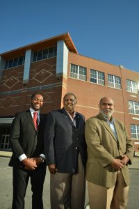 Kappa Alpha Psi Fraternity brothers Justin Lewis, Andrew Johnson, Jr. and William Bobo, Jr. in front of Buffalo Public School 76 Herman Badillo Bilingual Academy, a school their fraternity supports.